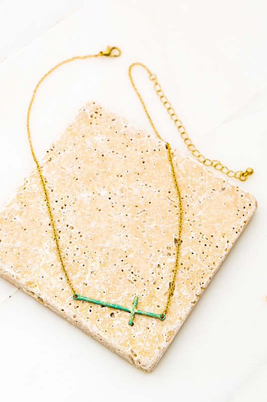 Introducing our Hammered Sideways Cross Necklace, where the traditional meets a unique twist. The patina finish on this horizontal cross necklace adds an artistic and distinctive touch to the classic design. Crafted with precision and style, this necklace is a symbol of both faith and individuality.