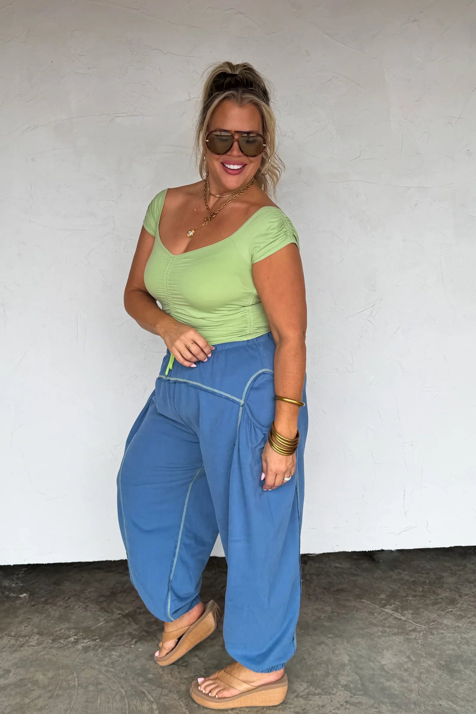 Keep it cool and casual in these lightweight contrast-stitch joggers! Designed with a relaxed, slouchy fit and drawstring waistband, these pants deliver effortless comfort and style. The playful stitching and oversized pockets add a trendy touch, while the cuffed hems create a flattering silhouette. Perfect for lounging, travel, or everyday wear—these joggers are your new favorite laid-back essential!