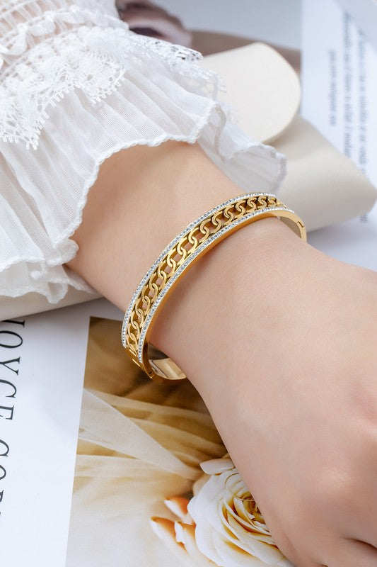 waterproof 2 tone chain pattern hinge bangle, featuring a cutout link chain pattern, pave rhinestones edge with white enamel settings, stainless steel with water proof PVD plating (physical vapor deposition)